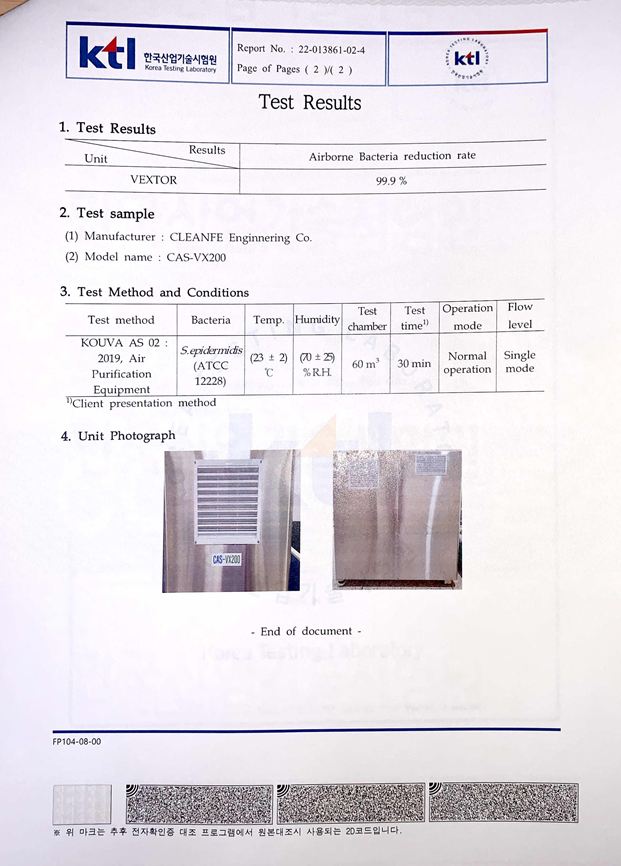 | 결론 | (제한적 조건에서만 기능하는 UV, 플라즈마 방식과 달리) 벡스터는 공기 중 바이러스를 확정적으로 포집/파괴하며, 넓은 공간의 대용량 공기도 신속하고 제대로 순환시켜 부유 바이러스의 인체침투 기회를 실질적으로 차단 | ||